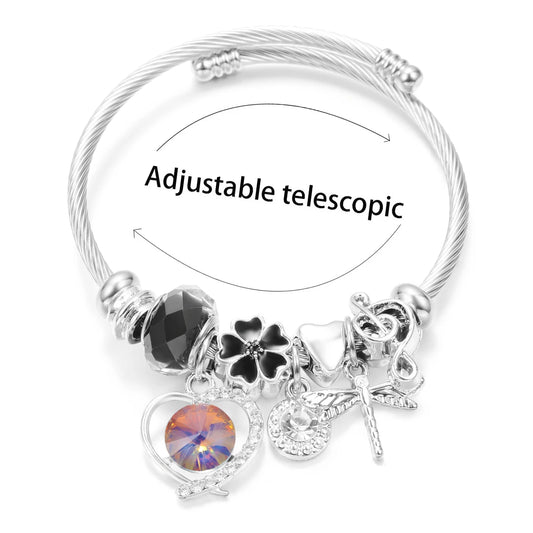 New Trendy Rhinestones Dragonfly Crystal Beaded Pendant Bracelet Stainless Steel 4 Colors Closure Bangles Women Bracelet Jewelry