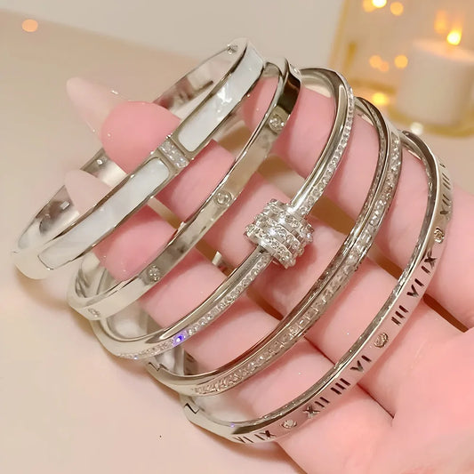 Yupsk 5Pcs/set Silver Color Stainless Steel Bracelet Shiny Zircon Inlaid Stackable Bangles Female Jewelry Gift