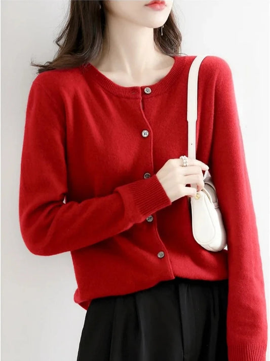 2025 New Worsted Spring And Autumn Women Cardigan Round Neck Knitwear Solid Color Fashion High-grade Knitwear Sweater
