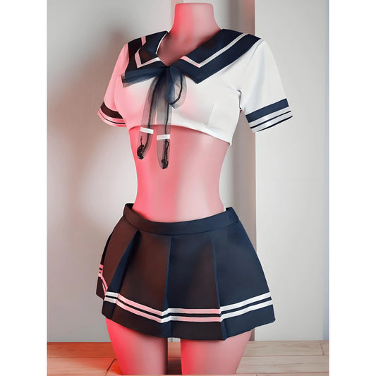 3pcs Sexy Sailor Outfit Women Lingerie Set Japanese Schoolgirl Cosplay Sleepwear Pleated Mini Skirt Crop Top Pajamas