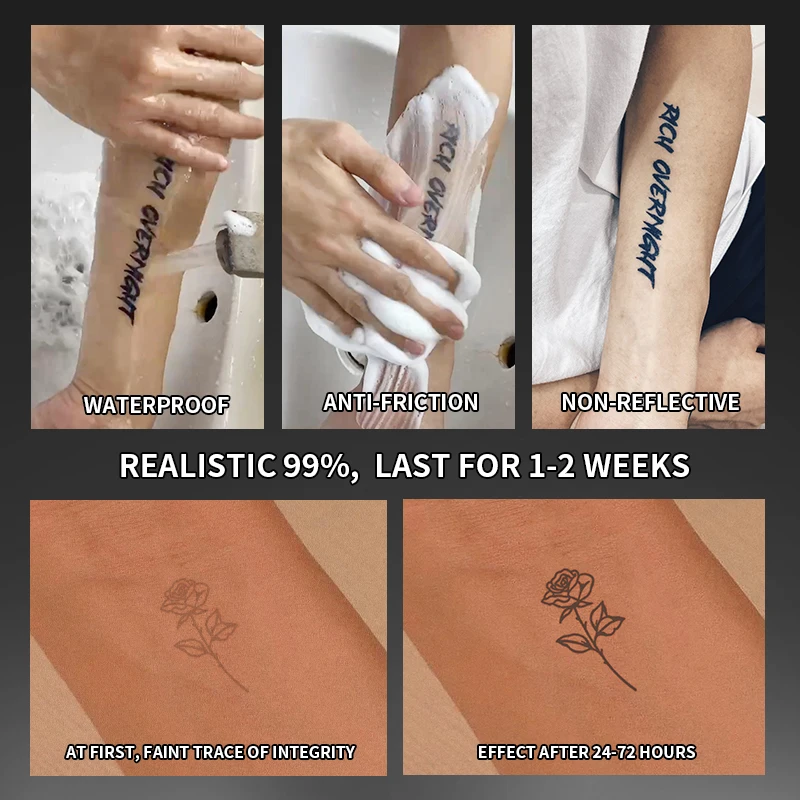 5. Direkt nach dem Aufkleben ist es transparent und muss mit der Zeit allmählich Farbe annehmen. Die Farbe entwickelt sich je nach Stoffwechselrate, normalerweise nach 24 bis 48 Stunden. Das endgültige Ergebnis erscheint und bleibt etwa 15 Tage lang sichtbar.