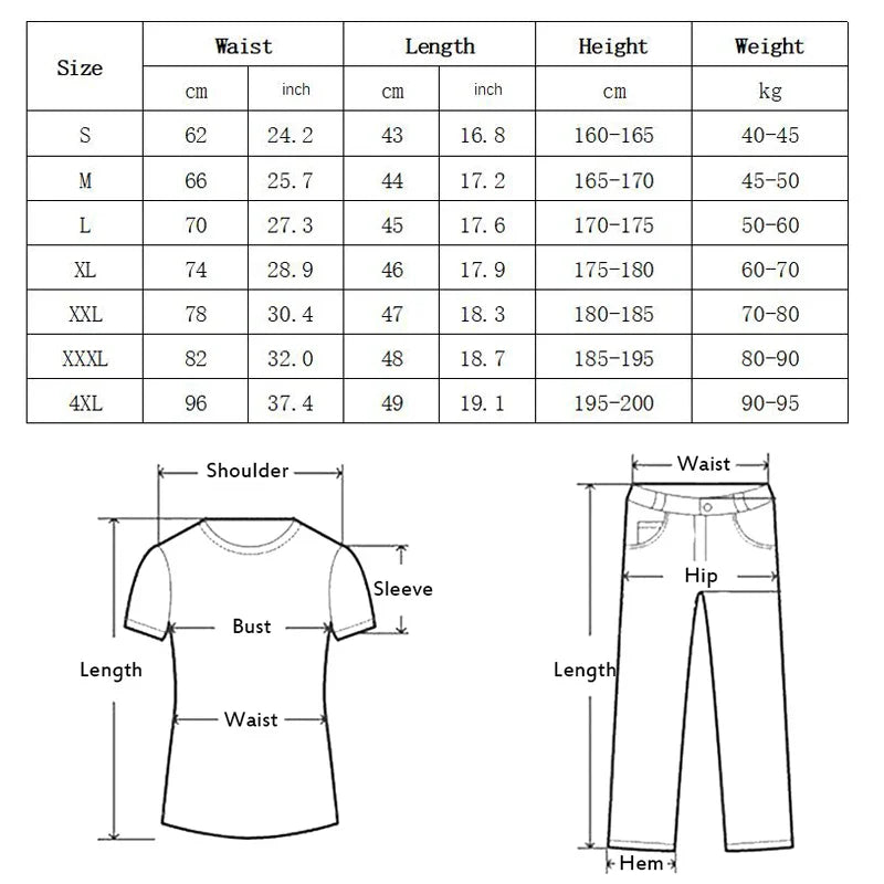 4XL =Waist 86cm, Length 49cm , For Weight 90-95kg Height 195-200cm;