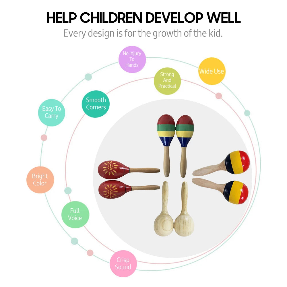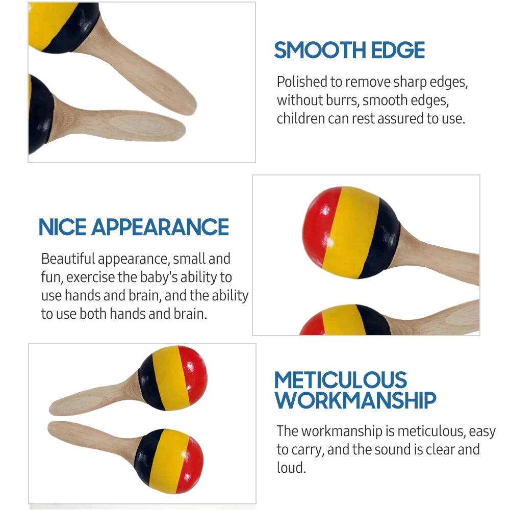 1. Unique design: The sand hammer is made of wood, with beautiful hand-painted patterns, bright colors, smooth glaze, nice sound, and comfortable handle for easy grip.