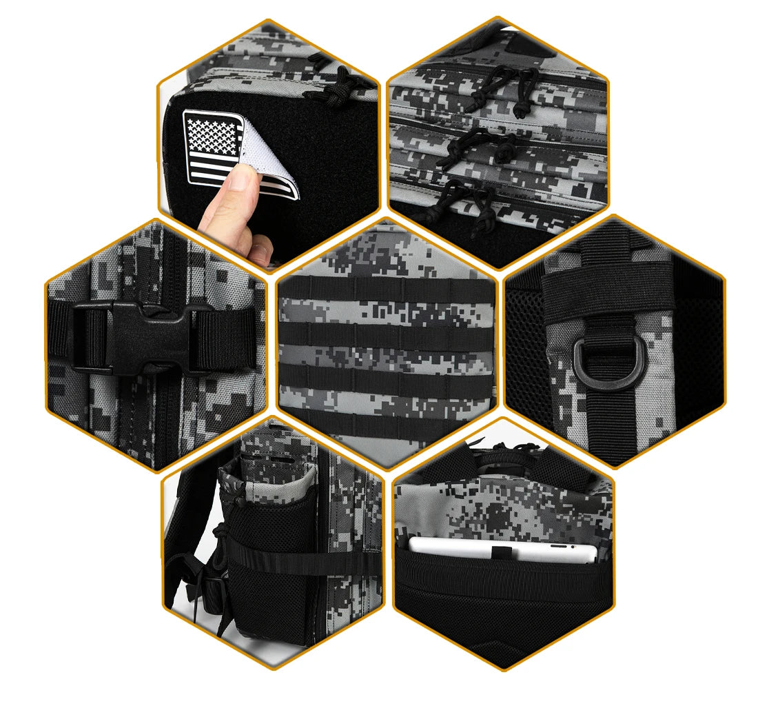 ¡¾THE SPACE YOU NEED¡¿This Tactical backpack size appro:50cm x 30 cm x 30 cm dimensions and appropriately sized 45L capacity, this pack has room for all of your essential gear. Large multi-layer interior storage compartments can accommodate a lot of outdoor equipment, and also meet your daily travel needs. large area of Velcro, make the backpack different with other backpacks, you can paste any patch you like. .one US flag patch for gift(can be removed).