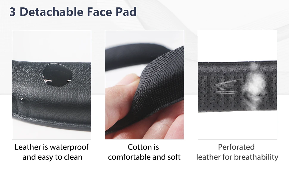 ¡¾3 detachable PU Leather Face Pad this Oculus Quest 2 face pad replacement kit includes 1 Sweat-Proof Leather Face Pad, 1 breathable holes Leather Face Pad and 1 Soft breathable Cloth Face Pad. 3 different detachable PU leather foam pads improve hygiene, immersion and comfort when you play, elevating your VR experience.