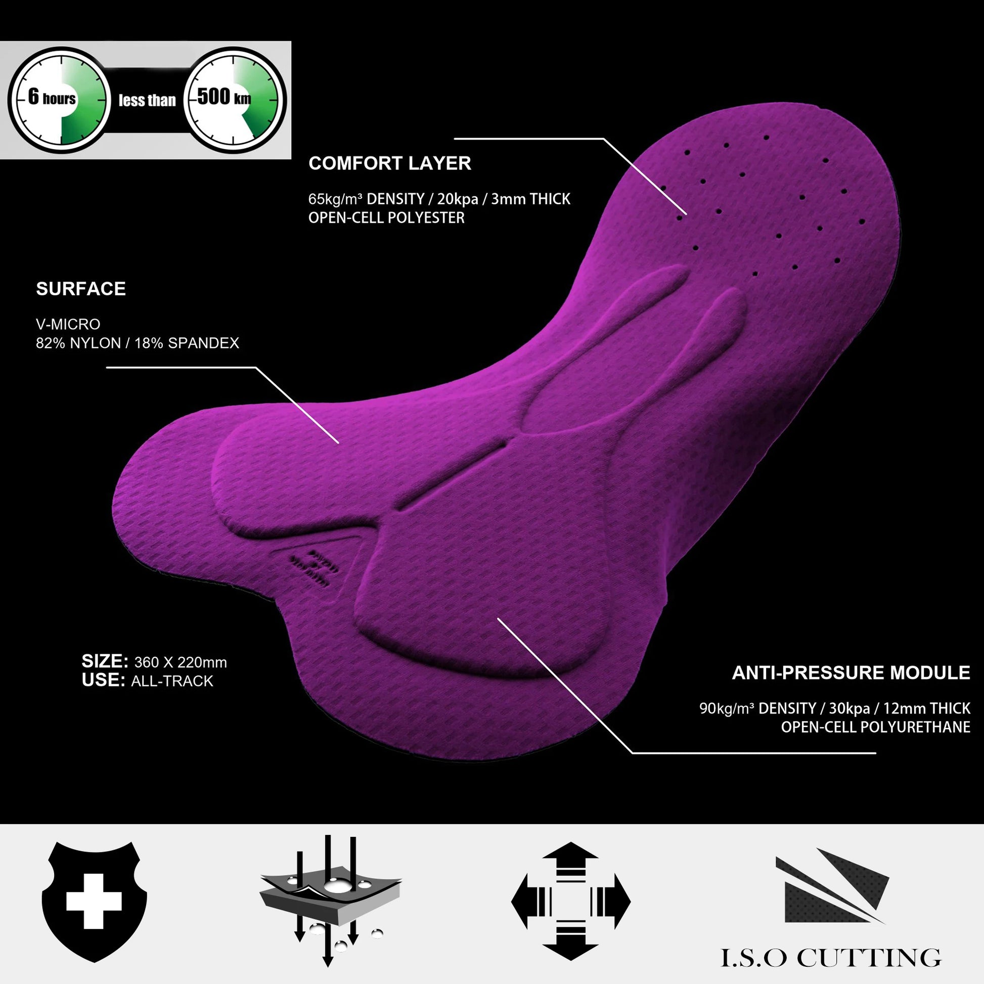 High density and widened anti-pressure module in perineal and ischiatic area from back side that make it perfect for road and off-road activities. While the top surface is characterized by being totally flush, providing close and continuous skin contact. This aspect is usually much appreciated among those riders that prefer a smooth, flat surface with no areas of transition or "steps" that denote density changes. The shaping of the central channel is engineered according to specific anthropometrical measurements, guaranteeing adequate protection and supporting male anatomy while in saddle, providing perfect fit, saddle stability and most importantly reliving pressure from the urethra, favoring blood flow. The "pelvic tract" area was tested and engineered to support the rotation of the pelvic bone on the saddle while pedaling. The ultra-high density insert makes this product ideal for 6-plus hour riders. The perfect combination of perforated foams and different foam densities provide breathability and freedom of movement.