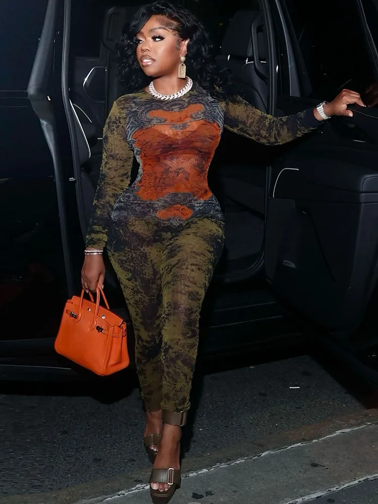 Weird Puss Tie-Dye Print Jumpsuit Women Fitness Stretch Tight Sexy o-Neck Full Sleeve Skinny Streetwear Autumn Zip Slim Overalls
